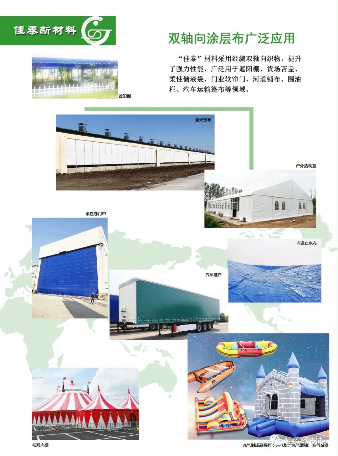 北京佳泰新材料有限公司是生產(chǎn)經(jīng)營(yíng)高強(qiáng)滌綸絲雙軸向PVC刀刮涂層材料的專業(yè)廠家,所生產(chǎn)的涂層布具有防水、阻燃、撕破斷裂強(qiáng)力好等性能,公司常規(guī)產(chǎn)品分為Q遮型、Q充型、I型、Z型、ZH型等,標(biāo)準(zhǔn)幅寬為2.1米,顏色多種可選。